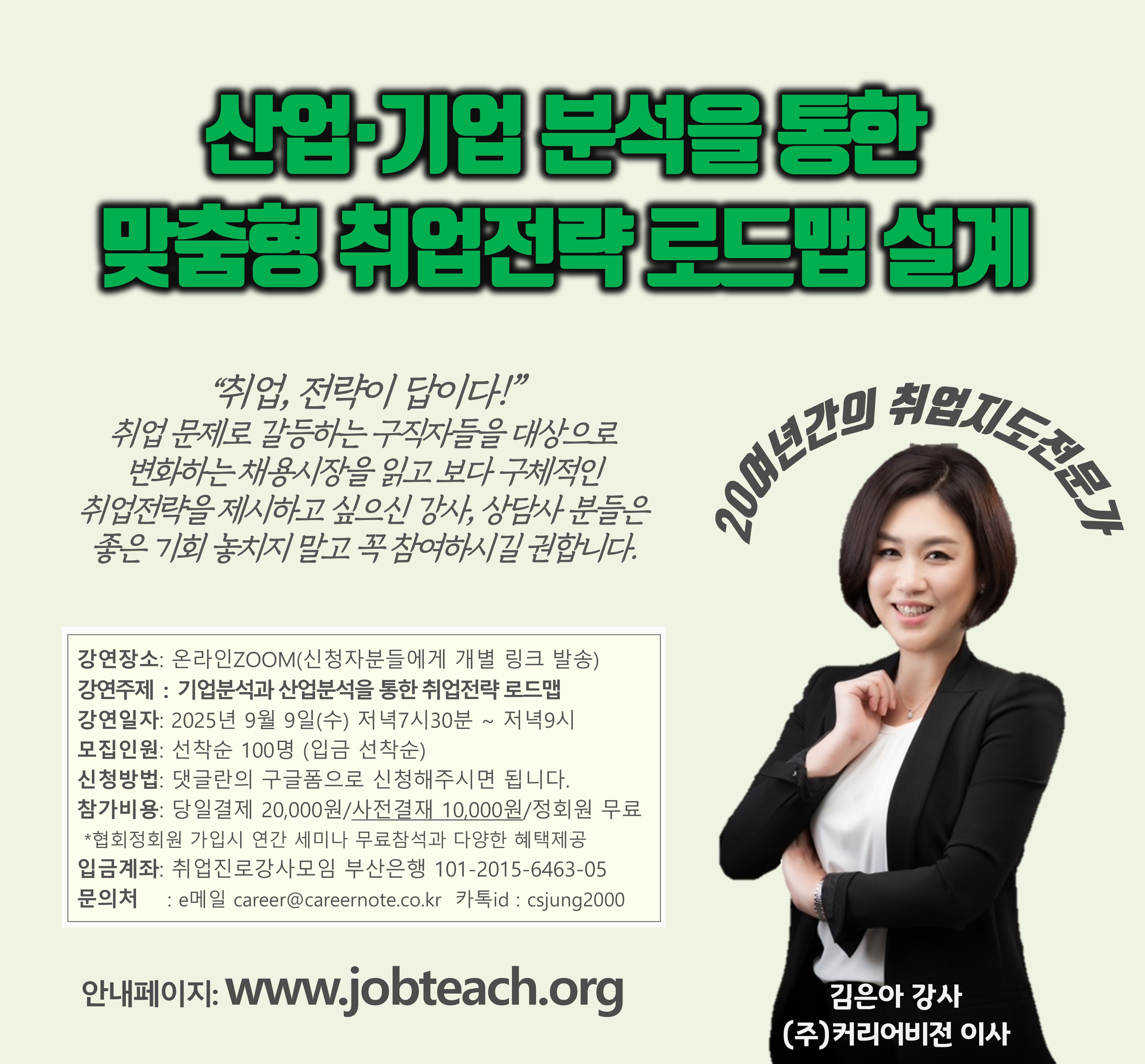 이런 구체적인 취업전략의 해법을 제시해줄 (주)커리어비전의 김은아 이사님을 어렵게 모셨습니다. 30여년에 가까운 세월 동안 고용노동부 경력을 바탕으로 오로지 고용 분야에서 종사하시며 취준생에서부터 고용분야 종사자들을 위한 전문교육에 이르기까지 전문적으로 활동을 해오고 계신데요. 워낙 바쁘게 활동하고 계신 분이라 일반적인 대중 강연을 하지 않으시는 분인데 어렵게 모셨으니 좋은 기회 놓치지 말고 꼭 신청하시길 권합니다.