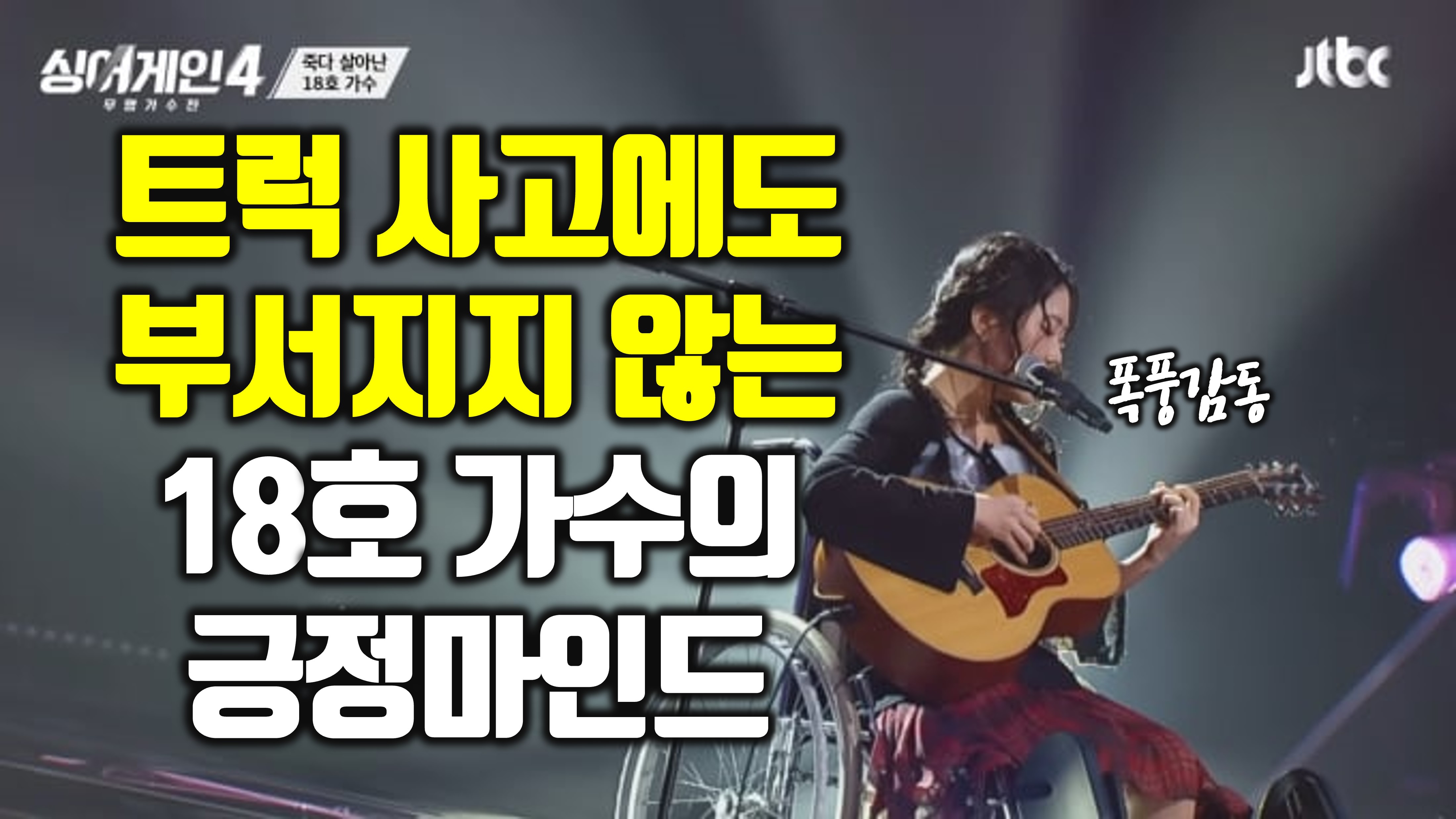 싱어게인 시즌4에 등장한 18호 가수님 사연 들어보셨나요. 트럭 사고에도 부서지지 않은 18호 가수의 긍정 마인드에 폭풍 감동해서요. 여러분들과 그 소식 공유해보려고 합니다. 무대가 시작되기 전, 18호 가수는 휠체어를 타고 천천히 등장했는데요.