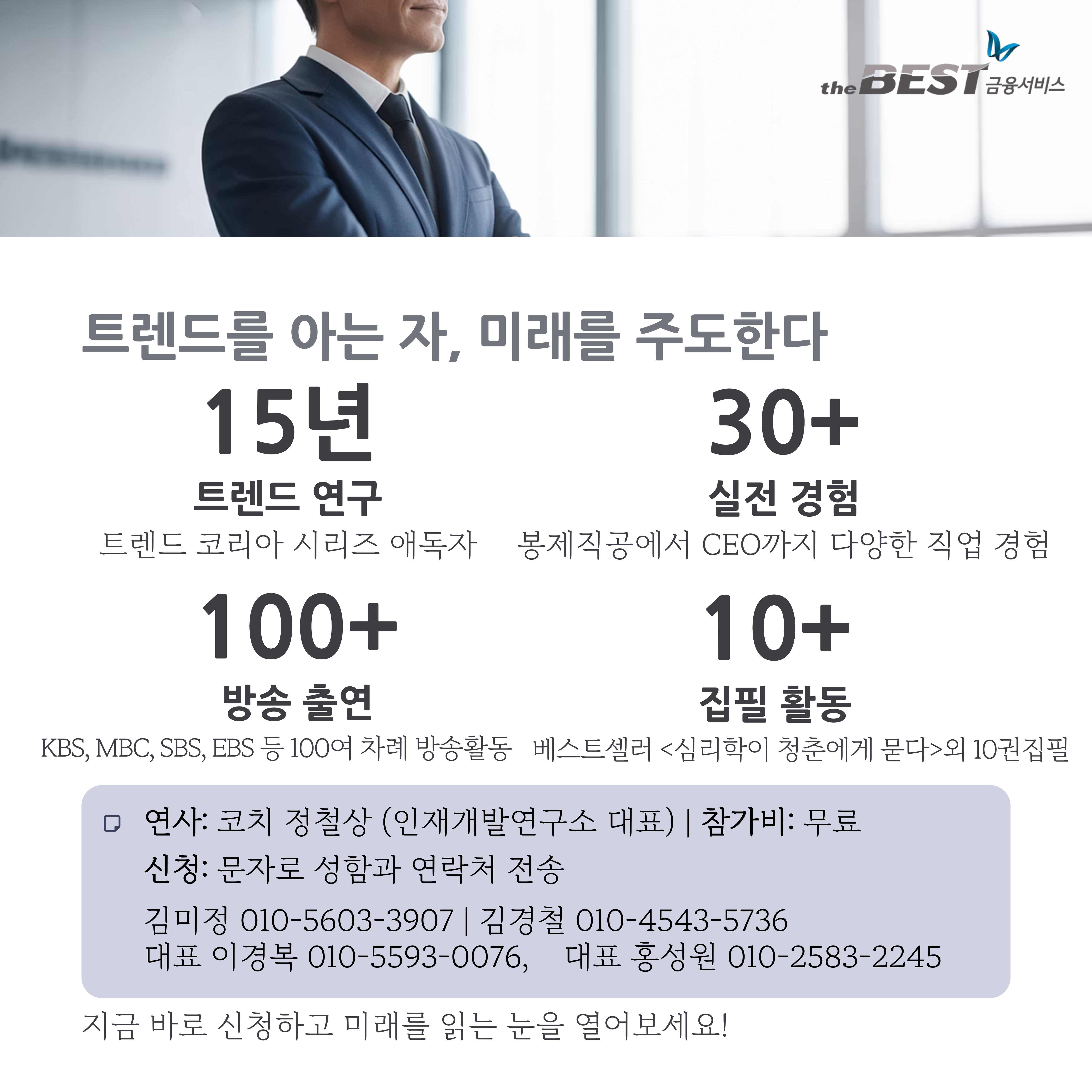 메트라이프생명에서 21년간 FC, 매니저, 교육전문가(TS)로 활동하며 업계 최고 수준의 성과와 경험을 쌓아왔습니다. 늘 설계사와 고객의 성장을 돕는 일에 보람을 느껴왔고, MDRT 달성으로도 검증된 전문성을 갖춘 금융·보험 전문가입니다. 이제는 “더베스트금융서비스 커리어본부”를 이끌며, 함께 성장하고 도전할 동료들과 새로운 비전을 실현하고 있습니다.