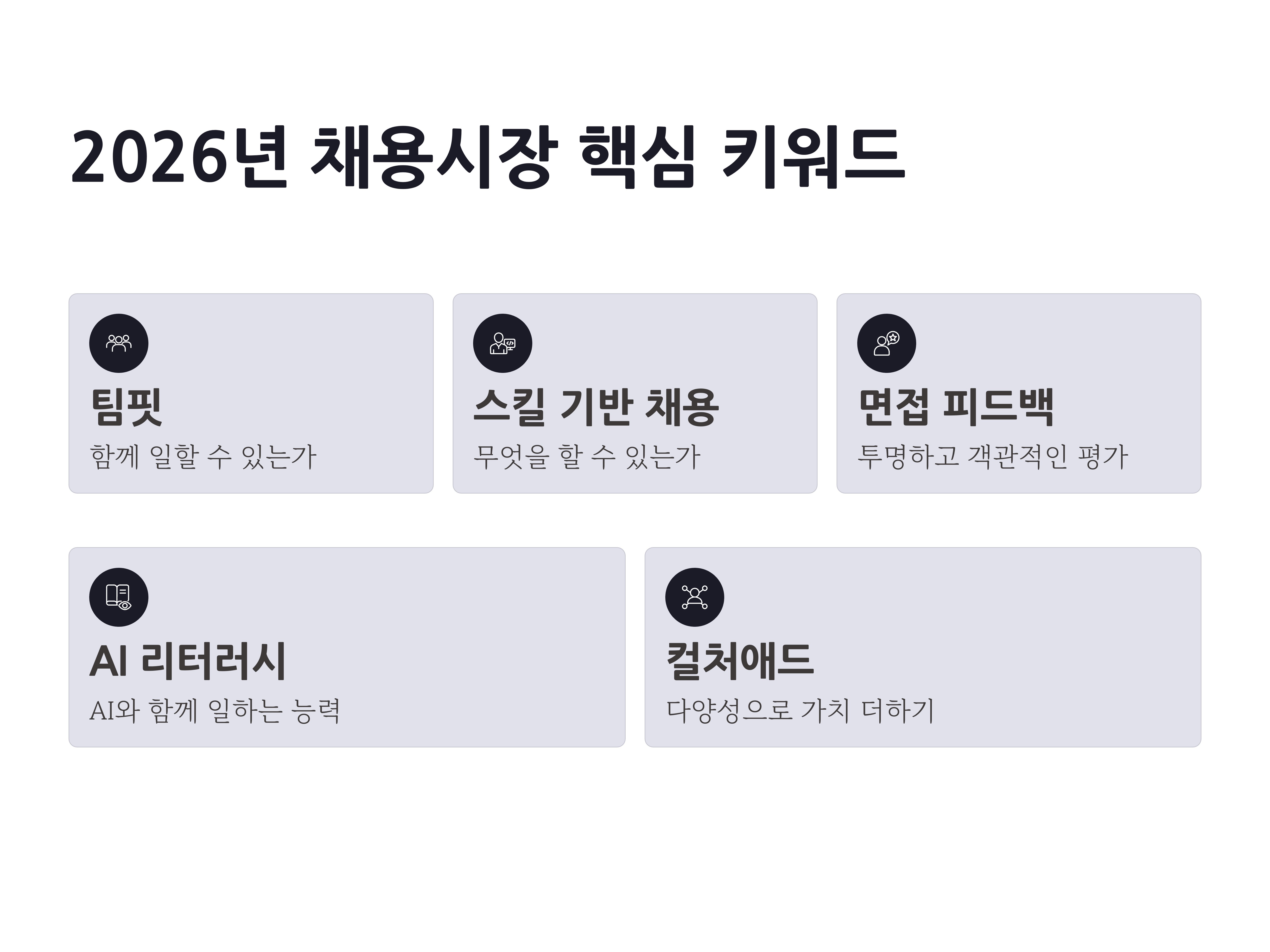 《채용트렌드 2026》 2부에서는 팀핏, 스킬 기반 채용, 면접 피드백 혁신, AI 리터러시, 컬처애드라는 2026년 채용시장의 핵심 키워드를 다룹니다.